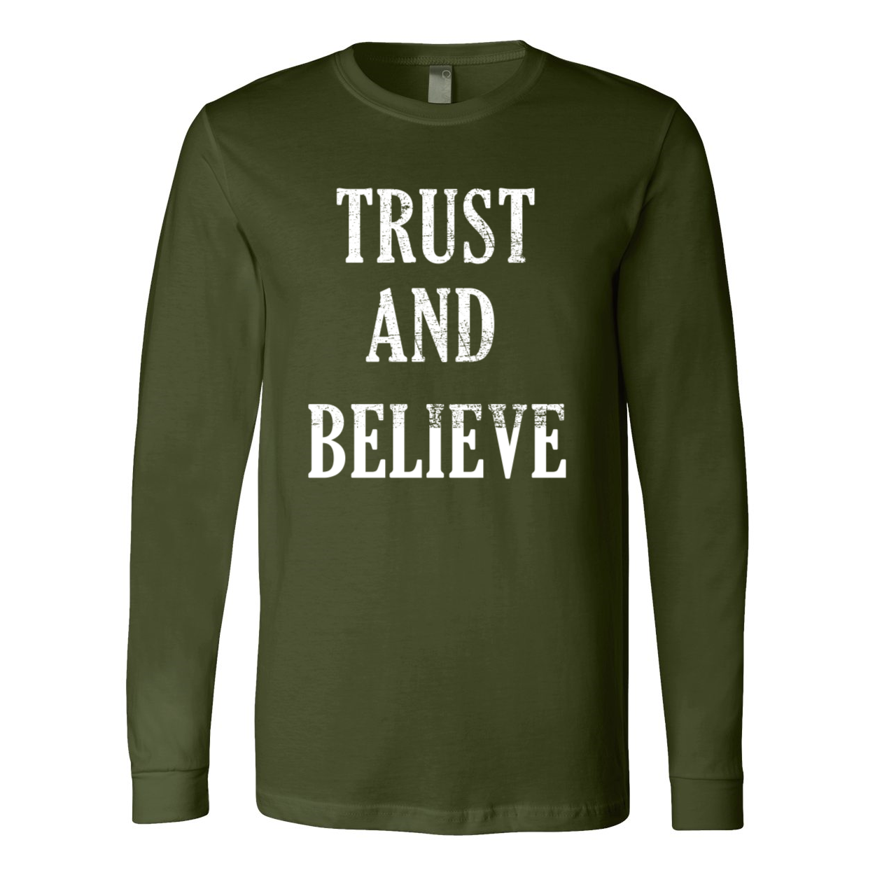 This beautifully designed long sleeve “Trust and Believe” tee is a great conversation starter about your trust and belief you have in the Lord about everything concerning your life. Inspired by Proverbs 3:5 Trust in the Lord with all your heart, and do not lean on your own understanding.